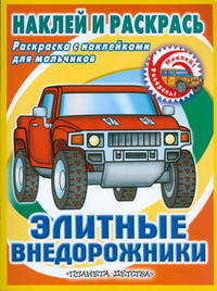 Издетальство АСТ выпустило в свет книгу "Элитные внедорожники" в 2010 году. Она на 8 страницах, у нее мягкая обложка. Автор издания Федоров А.В.. Книга выпущена в серии Наклей и раскрась по цене 49.00 рублей. ISBN номер 978-5-17-044647-6. Раскраска с наклейками для мальчиков..