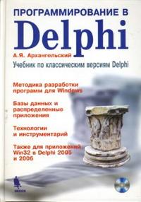 Издетальство Бином. Лаборатория знаний выпустило в свет книгу "Программирование в Delphi. Учебник по классическим версиям Delphi (+ CD-ROM)" в 2008 году. Она на 816 страницах, у нее твердый переплет. Автор издания Архангельский Алексей. Книга выпущена в серии - по цене 479.00 рублей. ISBN номер 978-5-9518-0235-4. Книга содержит методические и справочные материалы по системе визуального объектно-ориентированного программирования Delphi, версии 7-5. Дается методика построения прикладных программ, реализующих текстовые и графические редакторы, мультипликацию и мультимедиа, работу с базами данных, разработку отчетов, приложе-ний для Интернета, распределенных приложений, клиентов и серверов. Рассмотрены такие технологии доступа к данным, как BDE, ADO, InterBase Express, dbExpress, компоненты-серверы COM, технологии распределенных приложений: COM, CORBA, MIDAS, технологии Web Broker, WebSnap, IntraWeb, Web Services, Indy. Справочная часть книги содержит материалы по языку Object Pascal, функциям Delphi и API Windows, компонентам и классам Delphi, их свойствам, методам и событиям. Книга рассчитана как на начинающих, владеющих только основами какого-нибудь языка программирования, так и на опытных разработчиков. Может использоваться в качестве учебного пособия в ВУЗах, а также как пособие для самообучения..